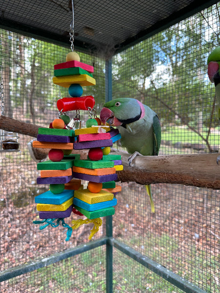 Image of Indy (Alexandrine Parrot) interacting with th 4 Turning Pine Stacks.